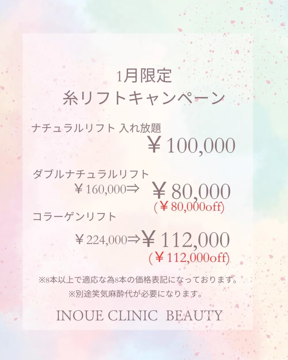 | 安心保証 | 術後一ヶ月以内に、左右差や仕上がりに不正があると医師が認めた場合には、再施術を行います。 |